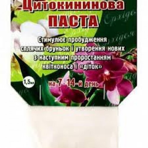 Цитокінінова паста (стимулятор росту), 1.5 мл., ТМ "ОВІ" Цитокінінова паста це стимулятор пробудження сплячих нирок та утворення нових з подальшим проростанням квітконоса та "діток" на 7-14 день. Дія цитокінінової пасти заснована на здатності препарату викликати масове поділ клітин рослини. Застосовується в садівництві та кімнатному квітникарстві, для стимулювання зародження, розвитку та росту нирок, добре зарекомендувала себе в роботі як із звичайними садово-плодовими культурами, так і з рідкісними, складними у догляді рослинами. У кімнатному квітникарстві застосовується для стимулювання до цвітіння та розмноження шляхом утворення "діток". Видових обмежень у застосуванні препарату немає. Ефективно реагують на препарат всі види та сорти орхідей, сенполій, сукулентів, гібіскусів, троянд, камелій, цитрусових та ін.