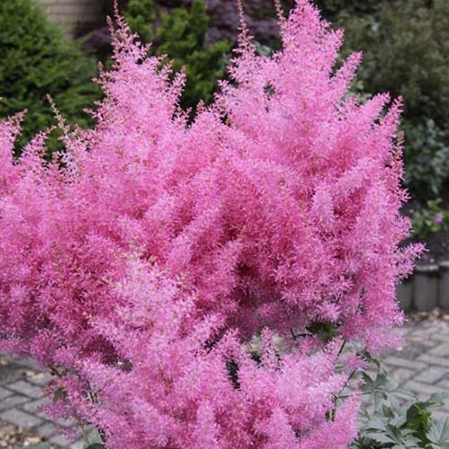 Астильба Арендса «Глория Пурпуреа» (Gloria Purpurea) высота куста 45 см, в цветущем состоянии — 70 см. Растение зимостойкое и неприхотливое. Ценится за пушистые розовые соцветия с легким ароматом и оригинальную ажурную листву. Цветет в июне-июле