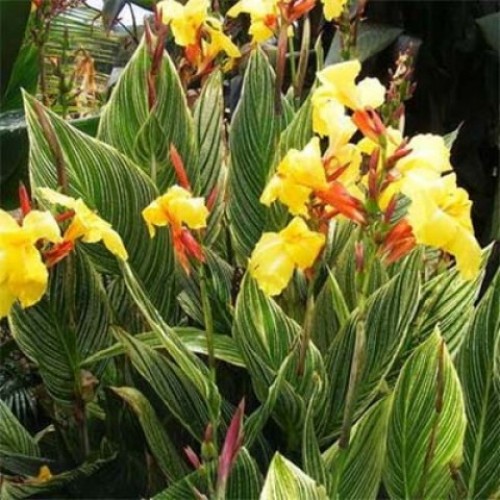 Бутоны красные. Цветки лимонно-жёлтые с белой полосой, выглядят забавно при роспуске. Листья зелёные с серебристо-белыми полосами. Высота 80-100 см. Великолепное растение для контейнеров. На зиму следует выкапывать с комом земли и хранить в сухом прохладном помещении. Место солнечное, защищённое от ветра. Почва рыхлая, влажная, богатая органикой. Зона 7 (до -15ºС)
