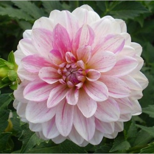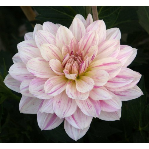 Світло-рожеві пелюстки з бузковими смугами та кропом. Розмір суцвіття: 10-15 см. Висота куща: 90-100 см.