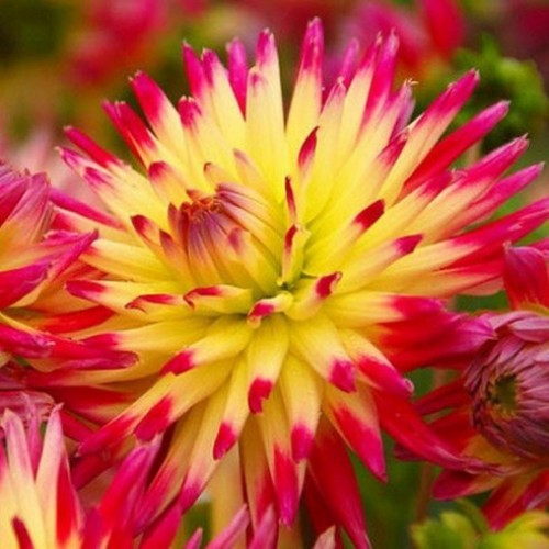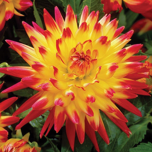 Жовта махрова жоржина з червоними кінчиками пелюсток Чудовий сорт для зрізу. Розмір суцвіття: 15-18 см Висота куща: 90-110 см