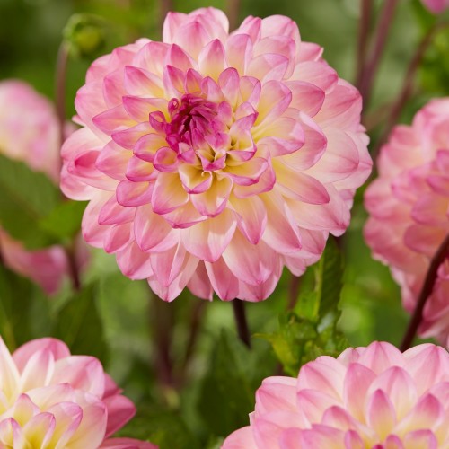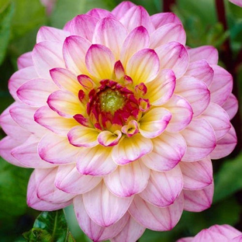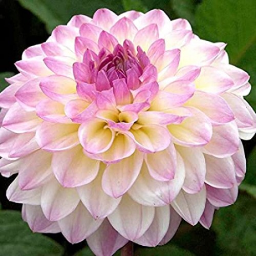 Квітка біла, з бузковими кінчиками та жовтим центром. Плескаті язичкові пелюстки, злегка закручені в трубочку, щільно прилягають одна до одної утворюючи кулю.