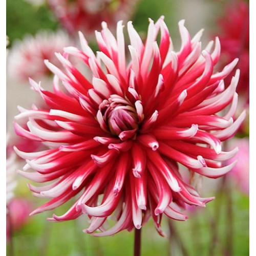 Эффектное многолетнее растение. Огромные и пышные цветы состоят из множества остроконечных лепестков, свернутых в длинные, тугие трубочки. Основной рубиновый окрас цветков разбавлен вкраплениями белоснежного оттенка, покрывающими лепестки от кончиков и чуть ли не до середины.