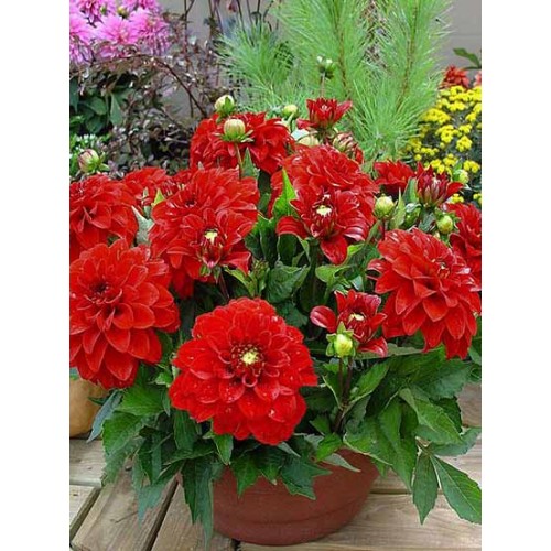 Низкорослый куст, усыпанный большим количеством насыщенно-красных цветков. Все цветы располагаются сразу над листвой, что придает георгине очень эффектный вид и делает данный сорт очень удачным на любом участке.