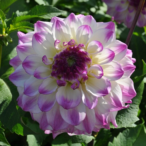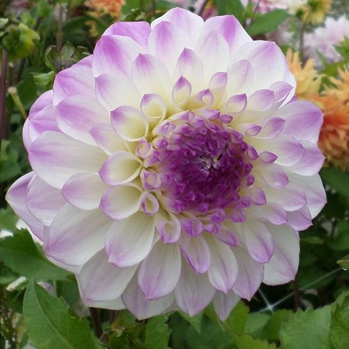 Велика, махрова, біла з ніжно-бузковими кінчиками, квітка діаметром 20-25 см. Пелюстки плоскі, широкі, загострені на кінцях. Розмір суцвіття: 20-25 см. Висота куща: 80-110 см.
