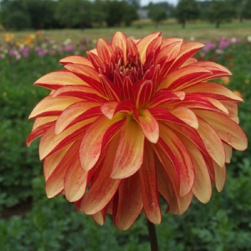 Дуже гарна махрова жоржина з ефектними золотистими суцвіттями.