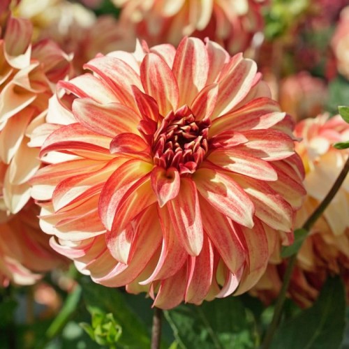 Кінчики загострених та відігнутих пелюсток прикрашені контрастним вишнево-червоним відтінком. Розмір суцвіття: 10-15 см. Висота куща: 80-100 см.