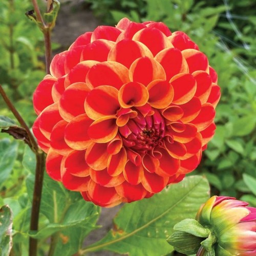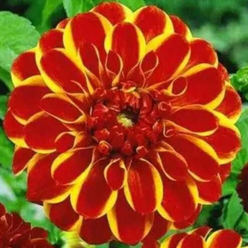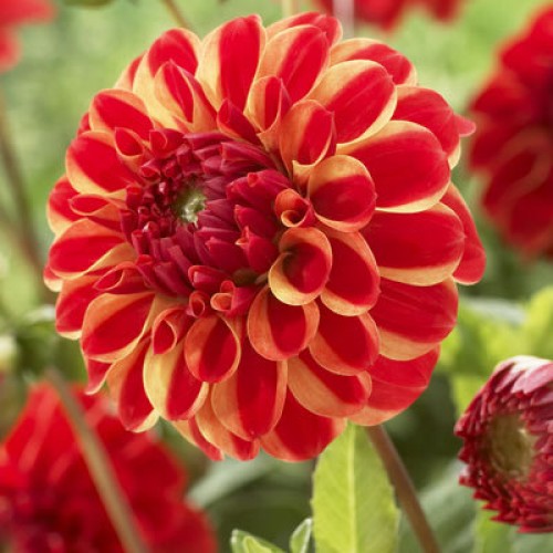 Мініатюрна декоративна жоржина. Пелюстки яскраво-червоні з жовтогарячою облямівкою. Розмір суцвіття: 8-10 см. Висота куща: 80-90 см.