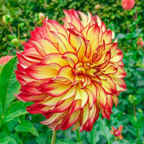 Дуже яскрава махрова жоржина з ефектними золотистими суцвіттями.