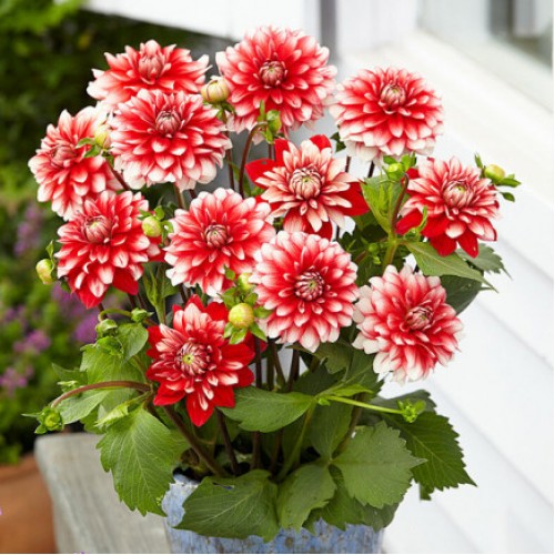 Суцвіття махрове, яскраво-червоне з білими кінчиками пелюсток Розмір суцвіття: 10-15 см Висота куща: 80-100 см