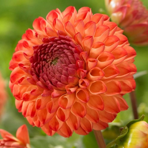 Мирелла - исключительной красоты шаровидный георгин. Цветок медно-оранжевый: насыщенные оранжевые и темно-красные оттенки прекрасно сочетаются друг с другом.