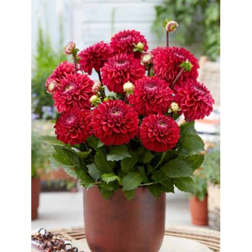 Низькоросла махрова жоржина з вишнево-червоними суцвіттями Розмір суцвіття: 10-15 см. Висота куща: 40-50 см.