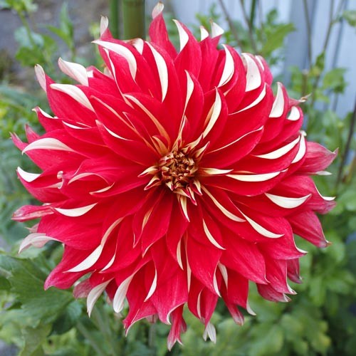 Цветок махровый, крупного размера, с заостренными и слегка закручеными лепестками ярко-красного цвета с переплетающимся нежно-желтым оттенком и с белой окантовкой по краю
