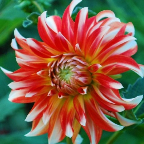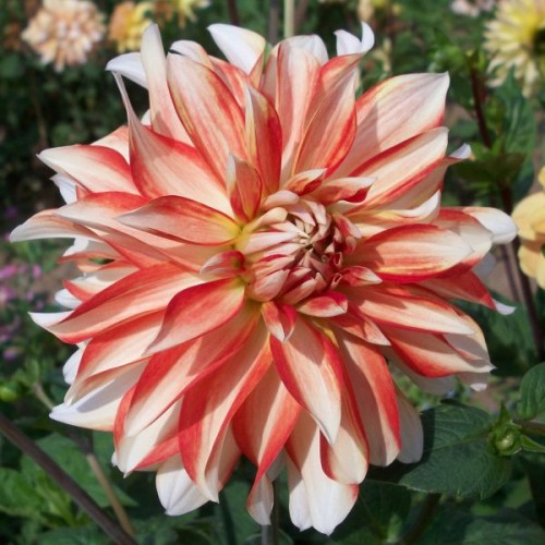 Квітки махрові, середнього розміру, витончено поєднують яскраво-червоне та біле забарвлення, мають трохи загострені пелюстки. Розмір суцвіття: 15-20 см. Висота куща: 90-110 см.