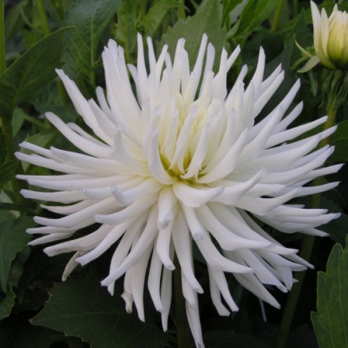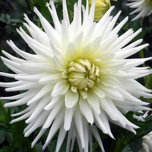 Суцвіття махрове, кактусового типу. Квіти великі, молочно-білого кольору з ніжно-жовтою серцевиною, пелюстки вузькі та закручені, зібрані в пишну розетку