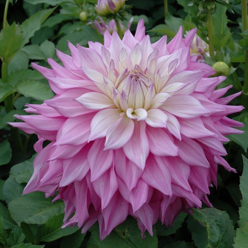 Крупноцветковый, махровый сорт. Цветок образует очень крупный бутон лилово-розового цвета с бледно-кремовой серединой.