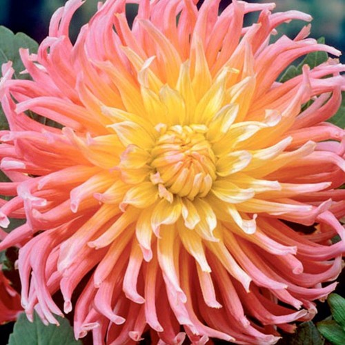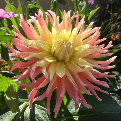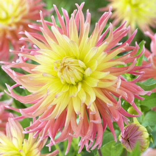 Кактусова махрова жоржина. Суцвіття із закритою серединою, пелюстки лимонно-жовті, оточені товстою окантовкою рожевого кольору. Кожна пелюстка тонка, гостро загострена і хаотично закручена