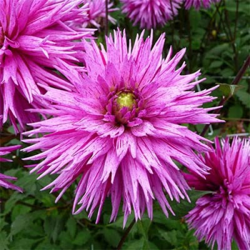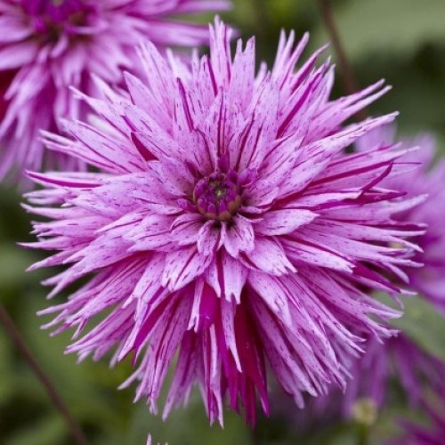 Ефектна жоржина з великими густо-махровими квітками. Голчасті пелюстки біло-рожевого відтінку з хаотичними темно-фіолетовими мазками.