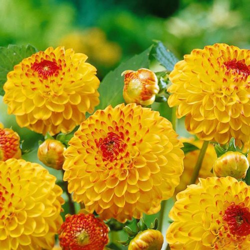 Привабливий та дуже яскравий сорт кулястої жоржини з акуратними та щільно набитими бутонами. Пелюстки жовто-гарячого кольору з червоними мазками на кінчиках