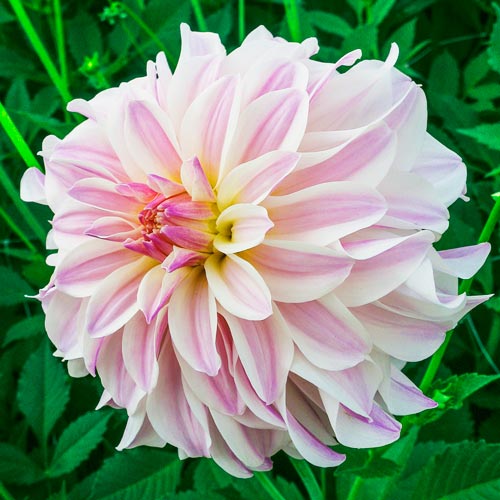 Цветок махровый, среднего размера, с нежно-розовыми лепестками с белыми краями. Лепестки плоские, широкие, по краю заостренные