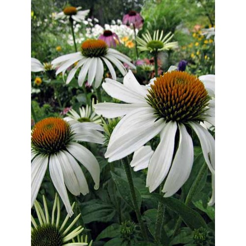 Эхинацея пурпурная Вайт Свон - многолетнее корневищное травянистое растение. Стебли прямые, высотой до 80 см. Прикорневые листья на длинных черешках. Соцветия - крупные корзинки, краевые цветки язычковые, белые; серединные - трубчатые, коричневые. Растение светолюбивое, предпочитает питательную, хорошо обработанную, суховатую почву. Цветет с июля по сентябрь. Эффектны в группе среди газона. Используют в букетах.