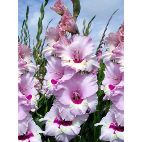 Яркий, веселый, трехцветный гладиолус, отличающийся особо чистыми, радостными тонами: светло-розовый цветок с сочно-малиновым в светло-желтой окантовке пятном в центре.