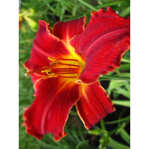 Выигрышный вариант любого сада, его яркость и аромат просто притягивает взгляды. Расцветает с начала июля по август, в этот период один за другим образуются ярко-алые, бархатистые цветы, с широкими верхними лепестками и тонкой белой волнистой каймой. Горло цветка лилейника окрашено ярко-желтым цветом, что идеально контрастирует с глубоким цветом лепестков. Тетраплоидный цветок диаметром 15-16 см, распускающимся на высоком прочном цветоносе высотой до 60-70 см.