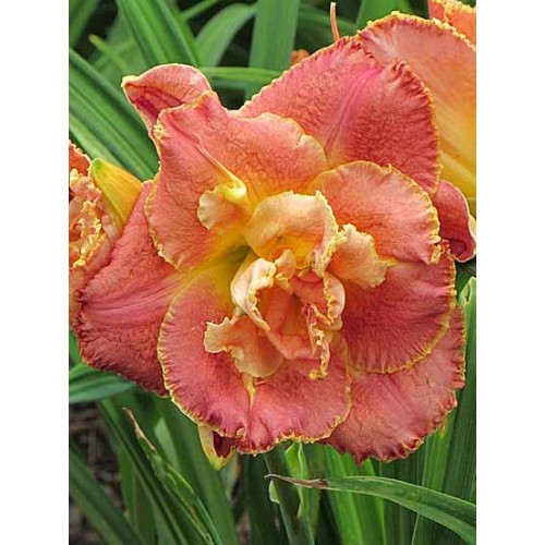Необычайно привлекательный и эффектный сорт. Цветки махровые, сильно гофрированные диаметром до 15 см. Окраска сложная розово-пурпурная с переходом к желтому центру. Лепестки плотной фактуры с золотистой бахромой.
