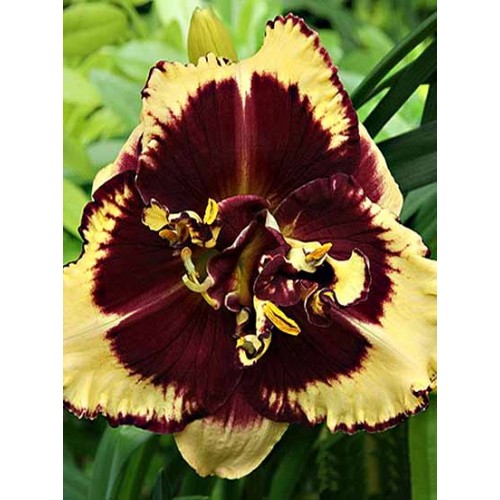 Светло-желтые цветы с ярким бордовым пятном у основания. Края гофрированных лепестков окантованы узкой каймой такого же, насыщенного бордового цвета. Листва узкая, мечевидная. Высота растения - 65 см, диаметр цветка - 15 см. Цветение июнь-июль.
