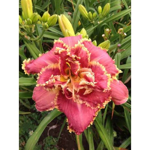 Крупноцветковый, махровый лилейник с зубчатыми краями. Основной цвет розовый, небольшой глазок чуть более тёмного оттенка, горло жёлтое. Размер цветка 16 cm, высота 50 cm. Цветет в илюле.