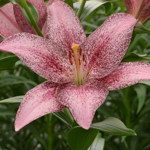 Квітки великі, пелюстки ніжно-рожеві з насиченим темно-вишневим крапом у центрі