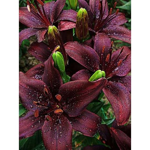 Самый темный на сегодня сорт азиатских лилий гибридов! Цветы 17 см в диаметре, темно-бордовые, иногда почти черные, глянцевые. Тычиночные нити бордово-черные. Пыльники оранжево-коричневые. Цветки широко раскрыты, классической звездчатой формы. На одном растении распускается от 5 и более бутонов.