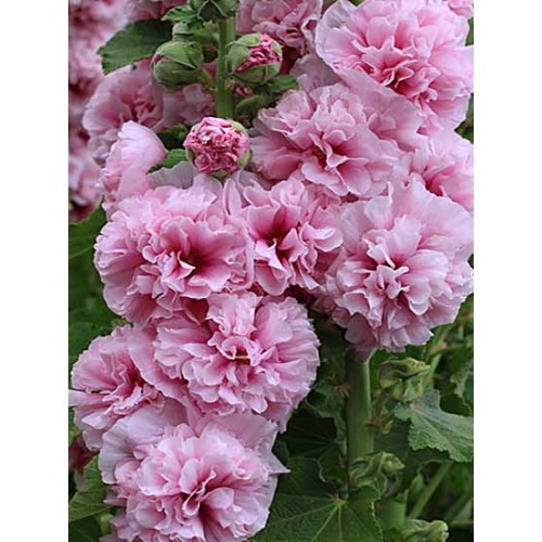 Махровые нежно-розовые цветки-помпоны! Стебли мощные ветвистые от самого основания. Листья крупные, лопастные, по краю зубчатые, до 10 см в поперечнике. Стебли и листья шершаво-волосистые. Цветки крупные, махровые, до 12 см в диаметре, ширококолокольчатые, желтые, собраны в длинные кистевидные соцветия, насчитывающие иногда до 150 цветков.