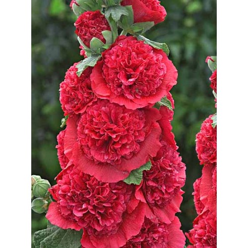 Махровые насыщено-красные цветки-помпоны! Стебли мощные ветвистые от самого основания. Листья крупные, лопастные, по краю зубчатые, до 10 см в поперечнике. Стебли и листья шершаво-волосистые. Цветки крупные, махровые, до 12 см в диаметре, ширококолокольчатые, желтые, собраны в длинные кистевидные соцветия, насчитывающие иногда до 150 цветков.