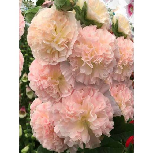 Махровые ветки-помпоны! Окраска нежно-оранжевая с кораллово-абрикосовым оттенком. Стебли мощные ветвистые от самого основания. Листья крупные, лопастные, по краю зубчатые, до 10 см в поперечнике. Стебли и листья шершаво-волосистые. Цветки крупные, махровые, до 12 см в диаметре, ширококолокольчатые, желтые, собраны в длинные кистевидные соцветия, насчитывающие иногда до 150 цветков.