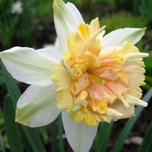 Нарцисс Petit Four выделяется на фоне других растений - сорт интересен своей необычной формой. Лепестки оттенка слоновой кости с легким зеленоватым оттенком. Причудливо-экзотичная крупная и широкая коронка имеет отогнутые, слегка гофрированный края и окаймлена золотистой полоской. Центр коронки густо набит кремово-абрикосовыми короткими лепестками и причудливо изогнутыми роговидными выростами.