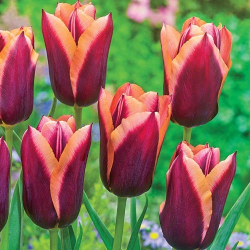 Тюльпанам класса Триумф характерны крупные бокаловидные цветки, довольно высокие цветоносы (40-70 см.) и хороший коэффициент размножения. Окраска цветов у тюльпанов этого класса самая разнообразная: от чисто-белой до темно-фиолетовой. Цветут Триумф - тюльпаны в конце апреля - начале мая, довольно продолжительное время и хорошо сохраняют форму бокала.
