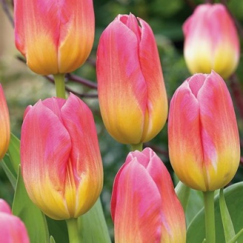 Тюльпанам класса Триумф характерны крупные бокаловидные цветки, довольно высокие цветоносы (40—70 см) и хороший коэффициент размножения. Окраска цветов у тюльпанов этого класса самая разнообразная: от чисто-белой до темно-фиолетовой. Цветут Триумф-тюльпаны в конце апреля - начале мая, довольно продолжительное время и хорошо сохраняют форму бокала.