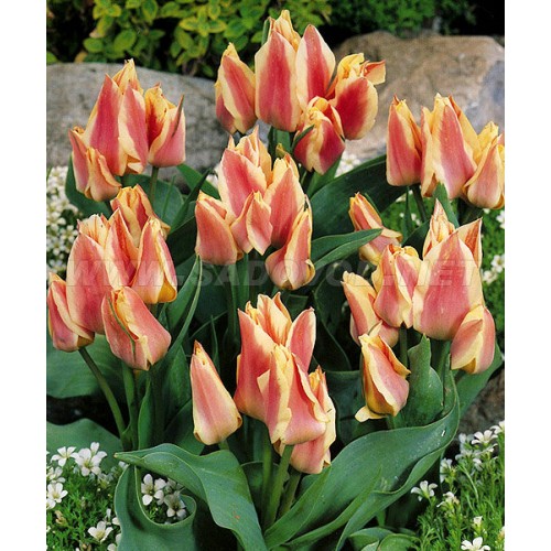 Из одной луковицы Quebec мы получаем целый букет цветов - цветет тюльпан Quebec образуя 3-5 цветков с одной луковицы (сорт формирует прекрасную цветочную композицию, расположив в центре самый высокий и мощный цветонос, окружив его более низкими побегами - бутоны несколько отличаются от основного, что делает облик букета очень интересным). Цветет Quebec до 2-х недель. Все это время его розово-красные лепестки сохраняют свою правильную форму, а широкая кремовая кайма не становится рыжей или белой. Подчеркивает обворожительную красоту цветов крапчатая листва.